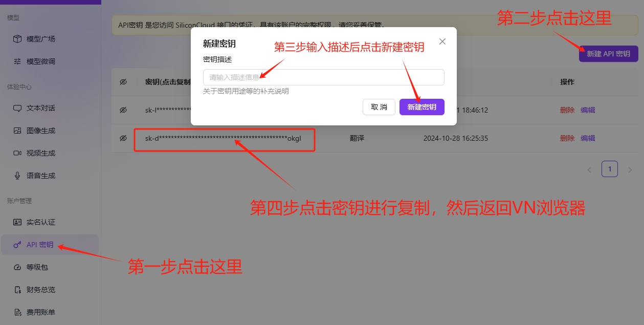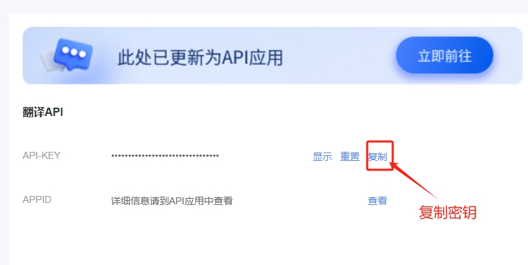 点击这里(https://niutrans.com/login?active=3)去注册,注册成功后点击页面右上角的控制台,或者直接访问控制台链接(https://niutrans.com/cloud/overview), 进入控制台后,点击左侧导航栏的“个人中心”,在页面右侧翻译API处复制密钥,然后去软件的设置中将密钥粘贴到小牛翻译的API-KEY处,然后点击测试,测试通过后保存即可。